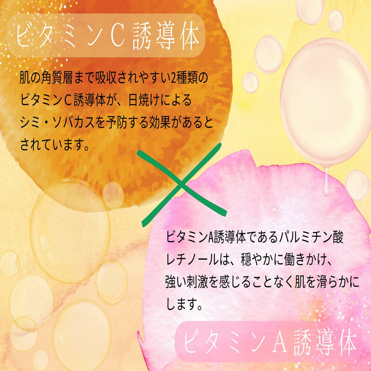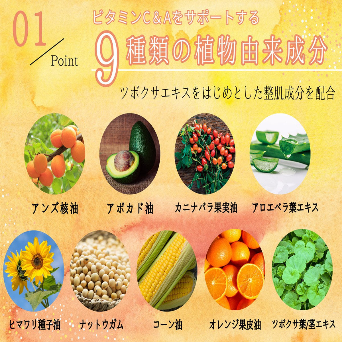 水、BG、グリセリン、ジグリセリン、グリチルリチン酸2K、カプリロイルグリシン、キサンタンガム、PEG-60水添ヒマシ油、アンズ核油、アボカド油、カニナバラ果実油、ヒマワリ種子油、ナットウガム、パルミチン酸レチノール、コーン油、トコフェロール、オレンジ果皮油、3-グリセリルアスコルビン酸、アロエベラ葉エキス、ツボクサ葉/茎エキス、パルミチン酸アスコルビルリン酸3Na、クエン酸、クエン酸Na